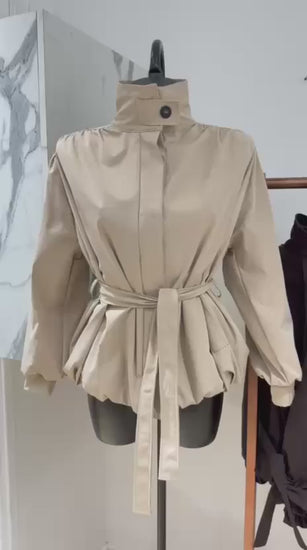 De pofmouwen en volumineuze onderkant geven de jas een luxe, vrouwelijke touch terwijl de hoge kraag en verborgen knopen zorgen voor een strakke en stijlvolle afwerking. Licht gevoerd en perfect voor de lente ideaal voor een brunch, city day of avondje uit.